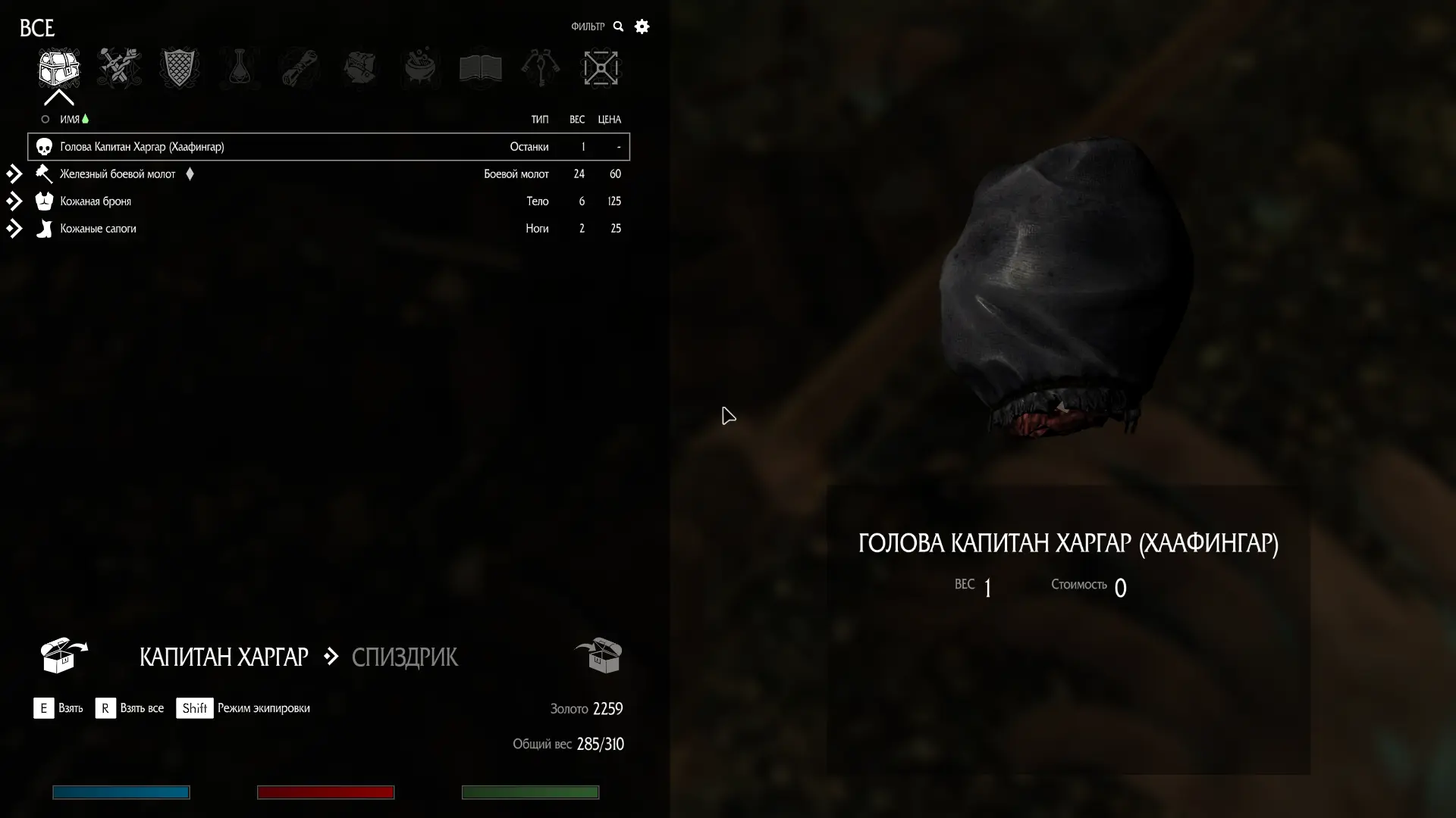 • Доказательства убийства: после смерти цели с наградой (бандита, великана или дракона) в их инвентаре появится особый предмет-доказательство. Получив его, герой действительно «снимает голову» с цели, чтобы отнести её ярлу.