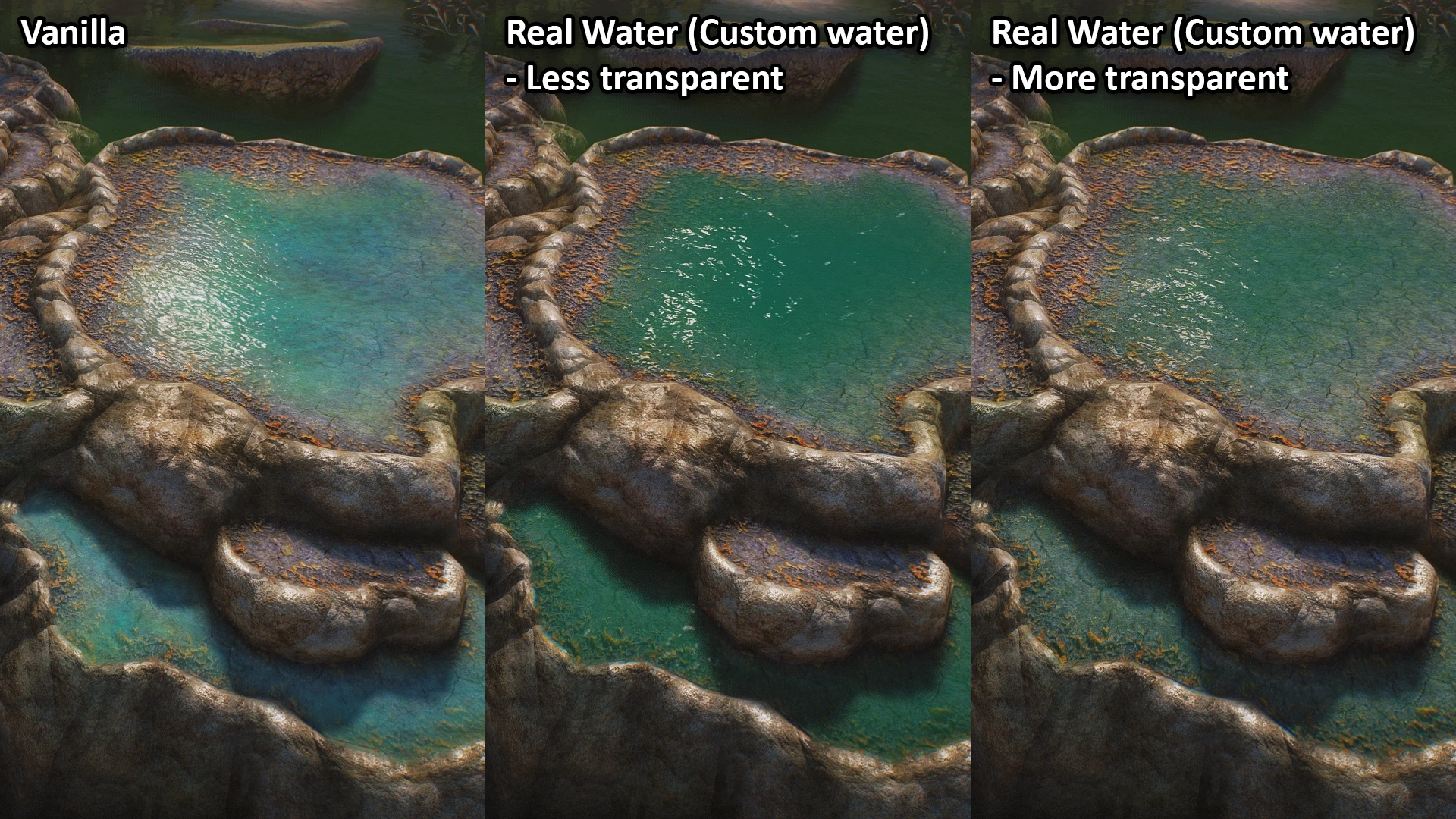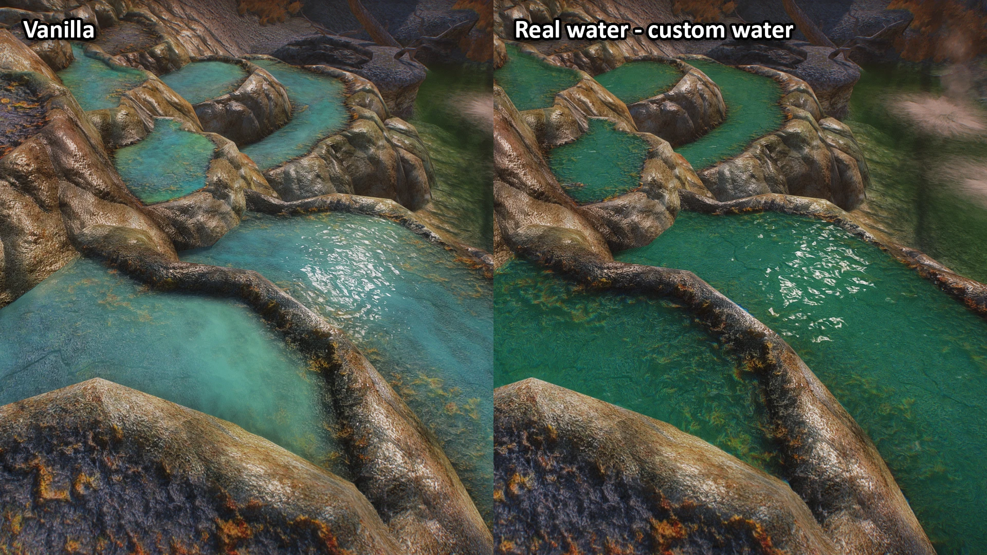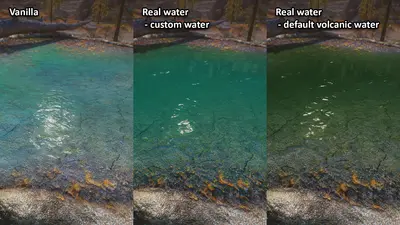 DefaultVolcanicWater — стандартная вода игры возле бассейнов, ванильный зелёный цвет. Влияние других модов на воду сохраняется.
