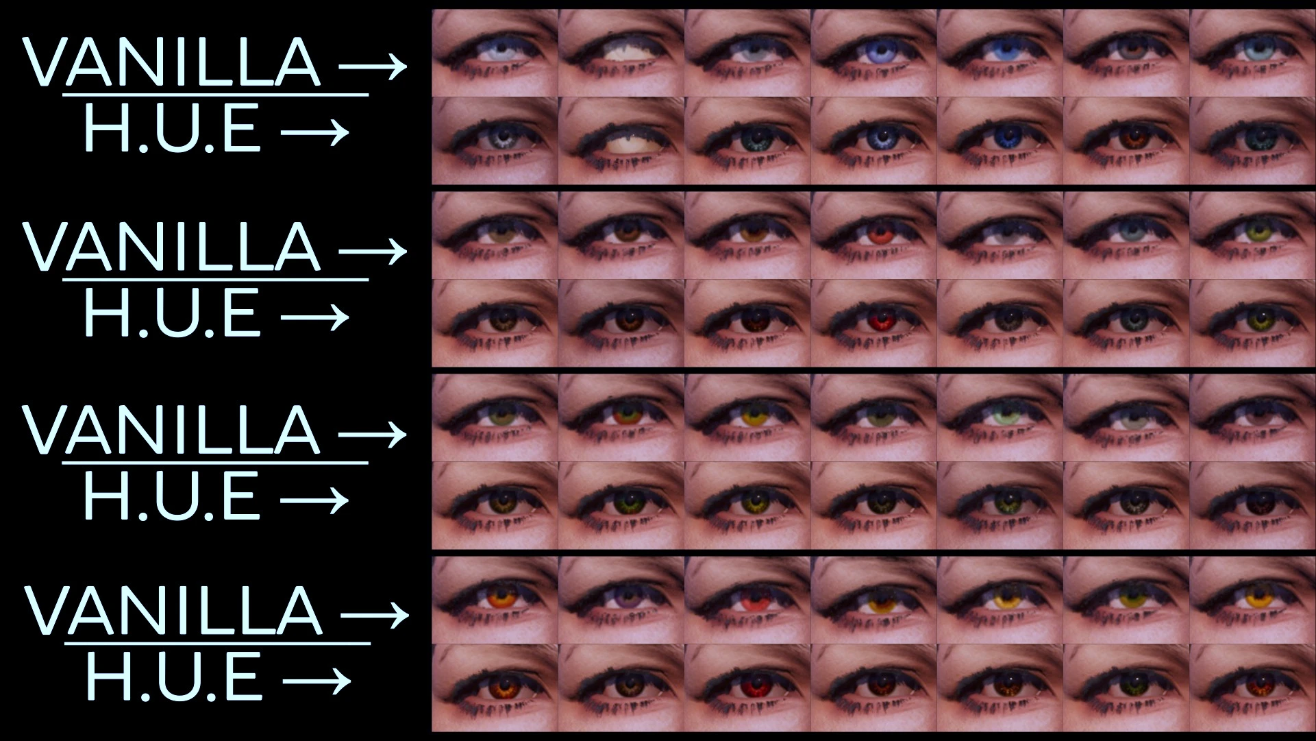 H.U.E – Handmade Unique Eyes полностью заменяет ванильные глаза у всех рас в Oblivion Remastered.