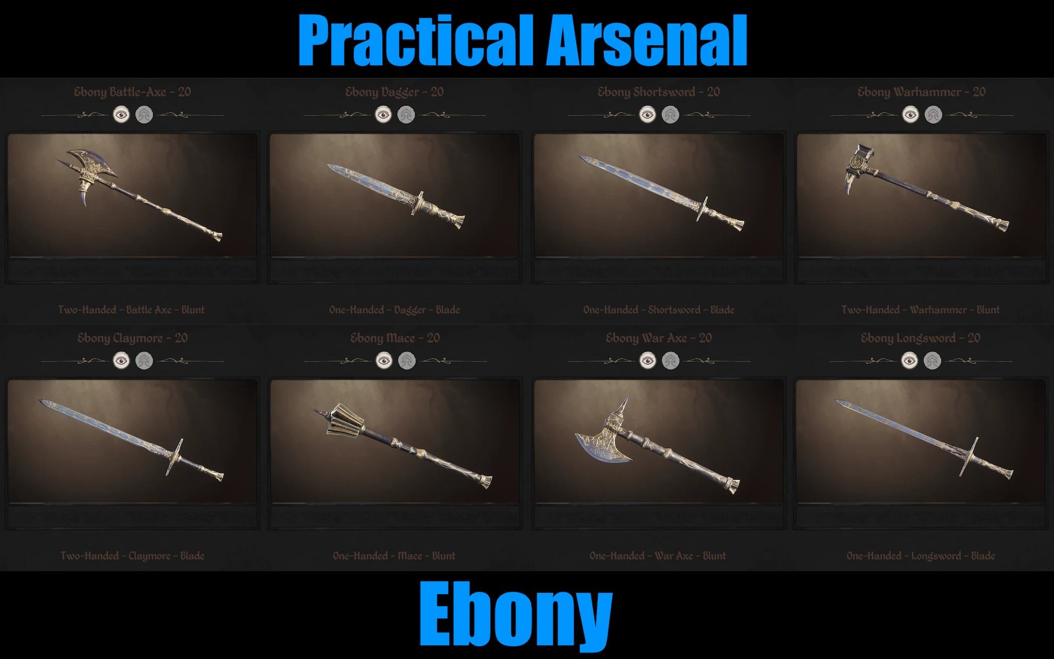 Practical Arsenal — Ebony — переработка эбонитового оружия в Oblivion Remastered, делающая его внешний вид более практичным и реалистичным. Мод заменяет оригинальные модели, не добавляя новых предметов, и выполнен исключительно на основе ванильных ассетов, благодаря чему совместим с любыми ретекстурами.